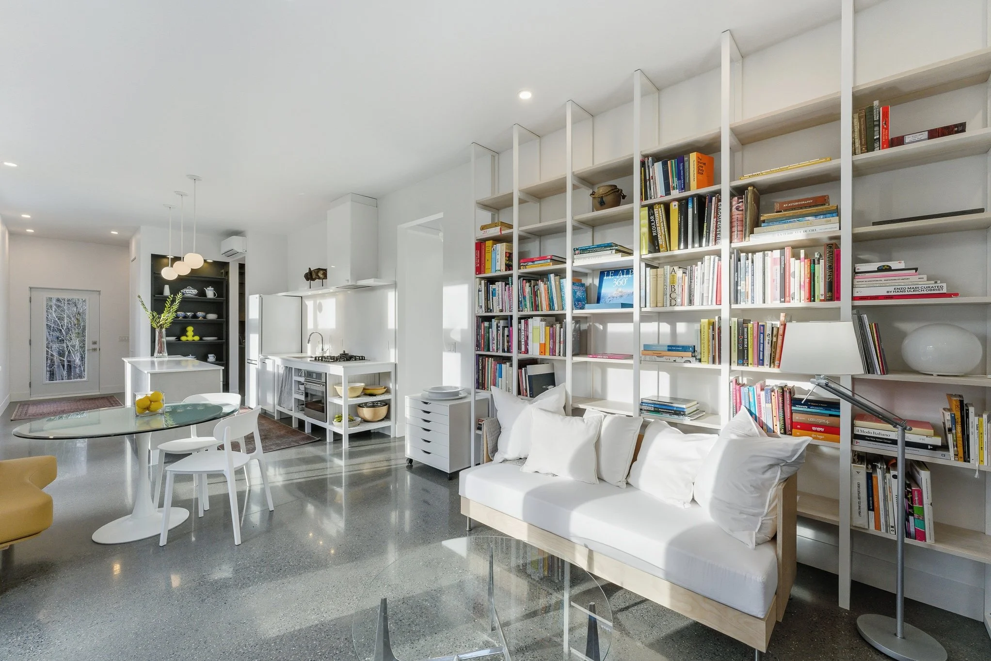 Vue de l'entréeLes occupants ont conçu cette maison comme une habitation pensée pour s’adapter aux changements de leurs besoins au fil du temps. Elle offre la possibilité de reconfigurer les espaces de vie et d’ajouter, au besoin, une chambre supplémentaire. Un bâtiment accessoire, tel qu’un studio, peut également être implanté à l’arrière du terrain ; la sortie électrique, déjà prévue dans le mur extérieur, en facilite l’aménagement futur.
