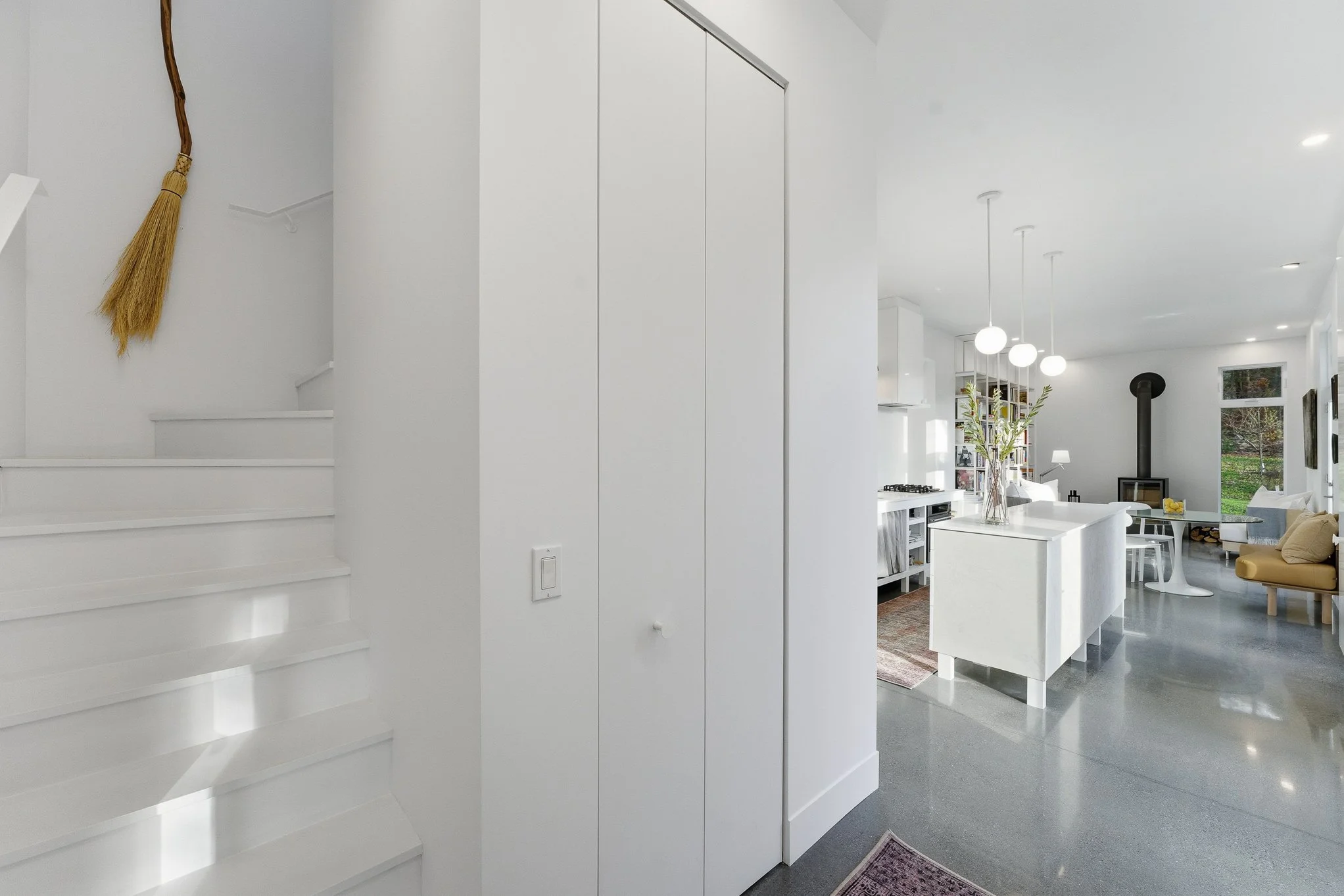 The upstairs loft space is currently used as a workspace, but can easily be adapted to different lifestyle scenarios, offering the flexibility to reconfigure the living spaces and, if required, to add an additional bedroom. With a third, full bathroom including a large linen closet for storage, the space is ready for your vision.