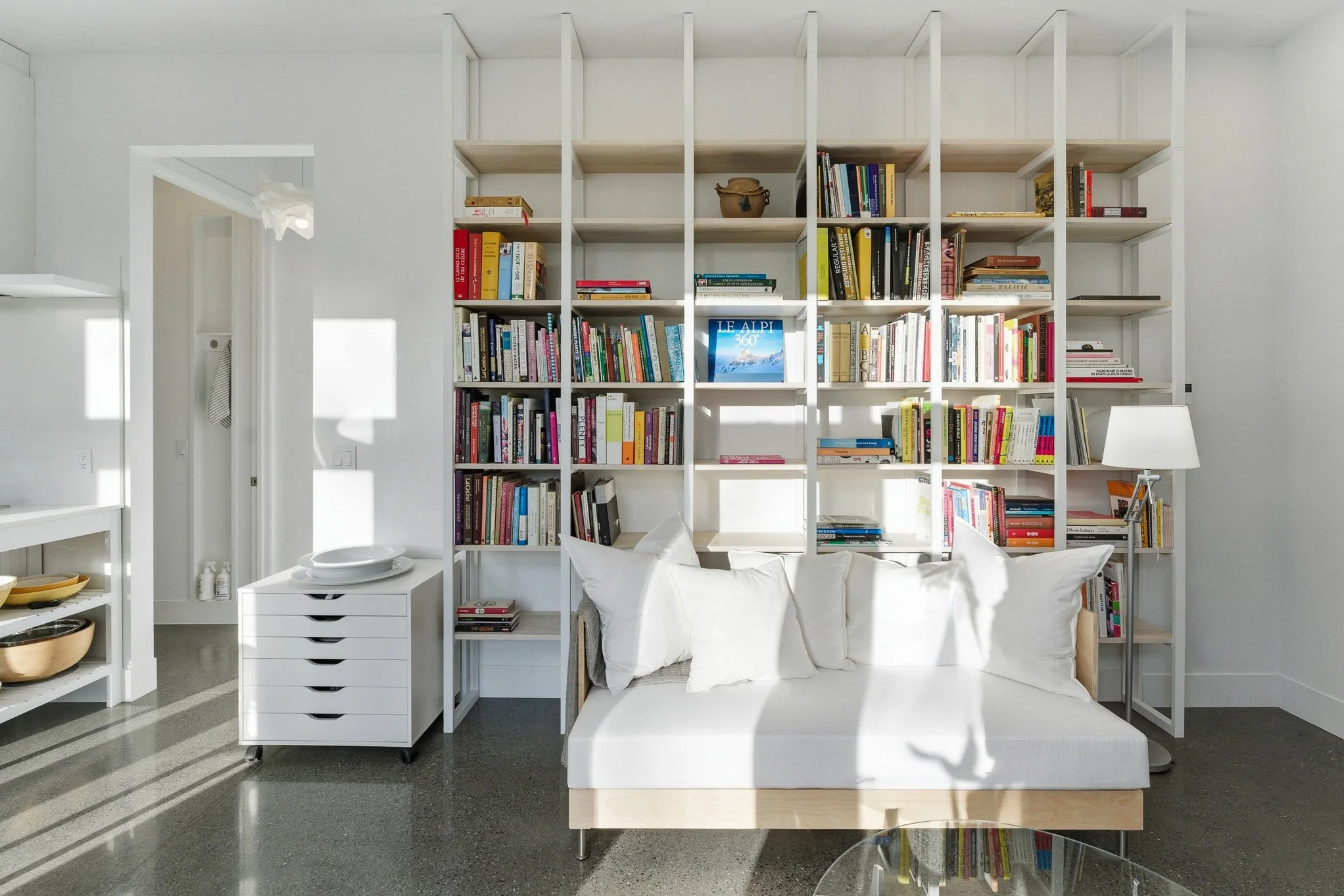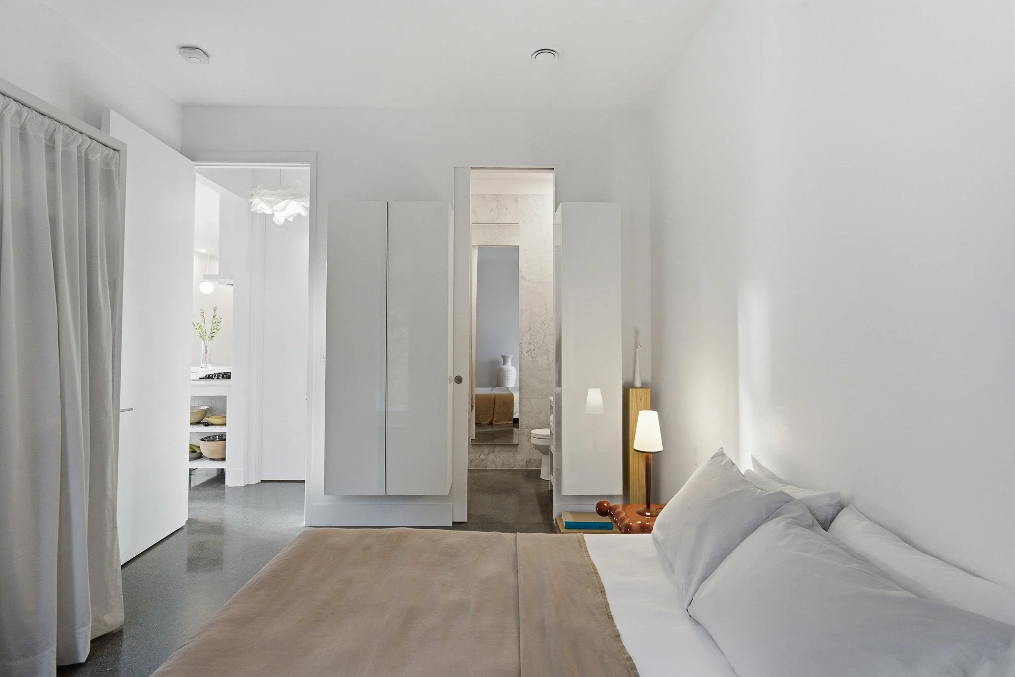 The simple, compact volume allows for abundant natural light through generous openings on the courtyard-facing façade, while also ensuring effective cross-ventilation. The rectangular geometry, combined with generous ceiling heights and integrated storage throughout, lends the home a sense of restrained elegance and enduring architectural coherence.